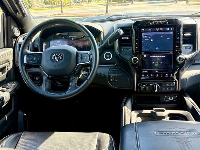 10 Speakers, 12 Touchscreen Display, 17 Speaker harman/kardon Premium Sound, 220 Amp Alternator, 3.73 Axle Ratio, 4 Adjustable Cargo Tie-Down Hooks, 4-Wheel Disc Brakes, 4G LTE Wi-Fi Hot Spot, ABS brakes, Active Noise Control System, Adaptive Cruise Control w/Stop, Adaptive Steering System, Adjustable pedals, Air Conditioning, Alexa Built-In, Alloy wheels, AM/FM radio: SiriusXM with 360L, Anti-Spin Differential Rear Axle, Apple CarPlay, Apple CarPlay/Android Auto, Audio memory, Auto High-beam Headlights, Auto-dimming door mirrors, Auto-dimming Rear-View mirror, Automatic temperature control, Black Exterior Truck Badging, Black Grille Limited, Black Headlamp Bezels, Black Ram Head Tailgate Badge, Black Tail Lamp Bezels, Black Wheel Center Hub, Body Color Grille Surround, Bodyside moldings, Brake assist, Bumpers: body-color, Center Hub, Compass, Connected Travel & Traffic Services, Connectivity - US/Canada, CTR Stop Lamp w/Cargo View Camera, Delay-off headlights, Digital 3.0 Rear View Auto Dimming Mirror, Digital Rearview Mirror, Disassociated Touchscreen Display, Driver door bin, Driver vanity mirror, Dual front impact airbags, Dual front side impact airbags, Electronic Stability Control, Electronically Controlled Throttle, For Details, Visit DriveUconnect.com, For More Info, Call 800-643-2112, Front anti-roll bar, Front Bucket Seats, Front Center Armrest w/Storage, Front dual zone A/C, Front fog lights, Front Performance Tuned Shock Absorbers, Front reading lights, Full Speed Forward Collision Warning Plus, Fully automatic headlights, Garage door transmitter, Genuine wood console insert, Genuine wood dashboard insert, Genuine wood door panel insert, Global Telematics Box Module (TBM), Google Android Auto, GPS Antenna Input, GPS Navigation, HD Radio, Heated door mirrors, Heated front seats, Heated rear seats, Heated steering wheel, Hill Descent Control, Illuminated entry, Instrument Cluster Theme 8, Integrated Voice Command w/Bluetooth®, Lane Keep Assist, Leather steering wheel, LED Bed Lighting, Limited Leather Bucket Seats, Limited Level 1 Equipment Group, Low tire pressure warning, Luxury Door Trim Panel (CTH), Manufacturer's Statement of Origin, Memory seat, MOPAR Deployable Bed Step, MOPAR Front & Rear Rubber Floor Mats, MOPAR Spray In Bedliner, Navigation System, Night Edition, Occupant sensing airbag, Off Road Package, Off-Road Information Pages, Outside temperature display, Overhead airbag, Overhead console, Panic alarm, ParkView Rear Back-Up Camera, Passenger door bin, Passenger vanity mirror, Pedal memory, Power Deployable Running Boards, Power door mirrors, Power driver seat, Power passenger seat, Power steering, Power Sunroof, Power windows, Quick Order Package 2HM Limited, Radio data system, Radio: Uconnect 5 Nav w/12.0 Display, Radio: Uconnect 5 Nav w/8.4 Display, Rain sensing wipers, RamBox Cargo Management System, Ramcharger Wireless Charging Pad, Rear anti-roll bar, Rear Performance Tuned Shock Absorbers, Rear reading lights, Rear seat center armrest, Rear step bumper, Rear window defroster, Remote keyless entry, Security system, Selectable Tire Fill Alert, SiriusXM Radio Service, SiriusXM w/360L, Speed control, Split folding rear seat, Sport Performance Hood, Steering wheel mounted audio controls, Surround View Camera System, Tachometer, Tilt steering wheel, Tip Start, Tow Technology Plus Group, Traction control, Trailer Reverse Guidance, Trailer Reverse Steering Control, Trailer Surround View Camera System, Trailer Tow Pages, Tri-Fold Tonneau Cover, Trip computer, Truck Bed Cargo Divider, Turn signal indicator mirrors, Variably intermittent wipers, Vendor Painted Cargo Box, Vendor Painted Cargo Box Tracking, Ventilated front seats, Voltmeter, Wheels: 20 x 8.0 Cast Aluminum Black, Wheels: 20 x 8.0 Diamond Cut Face Aluminum, Wheels: 20 x 8.0 Satin Carbon w/Chrome Inserts. Recent Arrival!